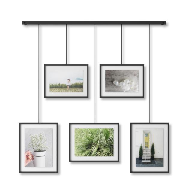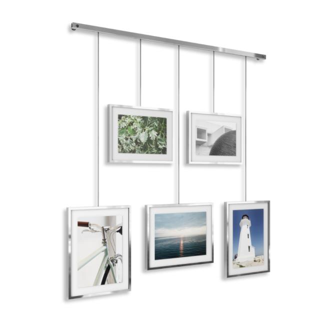 モダンで美しいレールから5個のフォトフレームを吊り下げた、ギャラリースタイルのフォトディスプレイです。