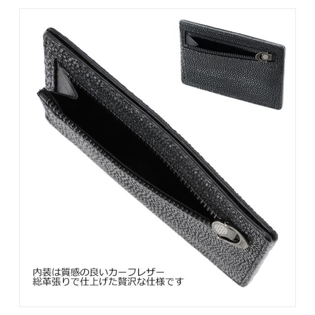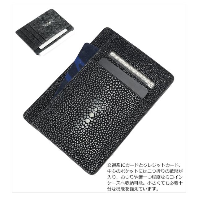 これひとつで出かけられる、小銭入れ付きカードケース 丈夫で耐久性に優れたエイ革を使用した多機能カードケース。フラグメントケースとも言われる、カードなどを少量持ち運ぶための機動性・携帯性に優れたミニ財布です。 交通系ICカードとクレジットカード、中心のポケットには二つ折りの紙幣が入り、おつりや鍵一つ程度ならコインケースへ収納可能。小さくても必要十分な機能を備えています。 内装は質感の良いカーフレザー総革張りで仕上げた贅沢な仕様です。