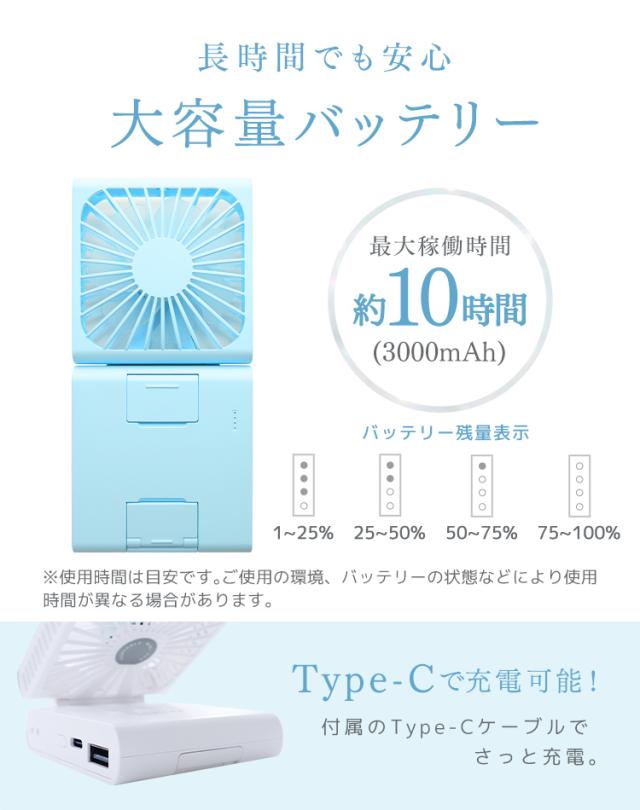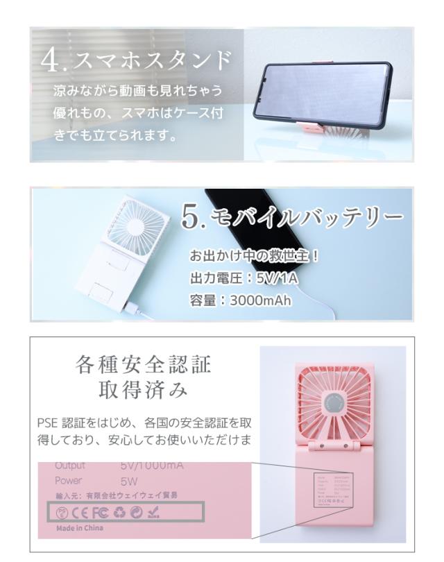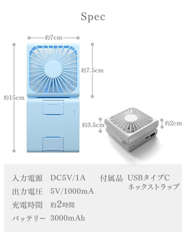 | 機能 | 風量3段階調節 手持ち・首掛け・卓上対応 スマホスタンド、バッテリー機能 |