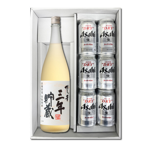 長期貯蔵の本格麦焼酎「博多の華 三年貯蔵」1.8Lとスーパードライ350ml6缶のギフト!