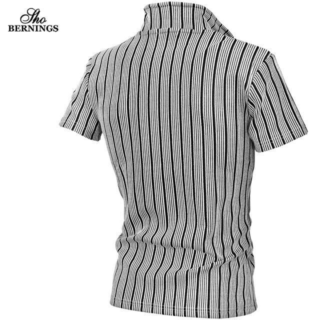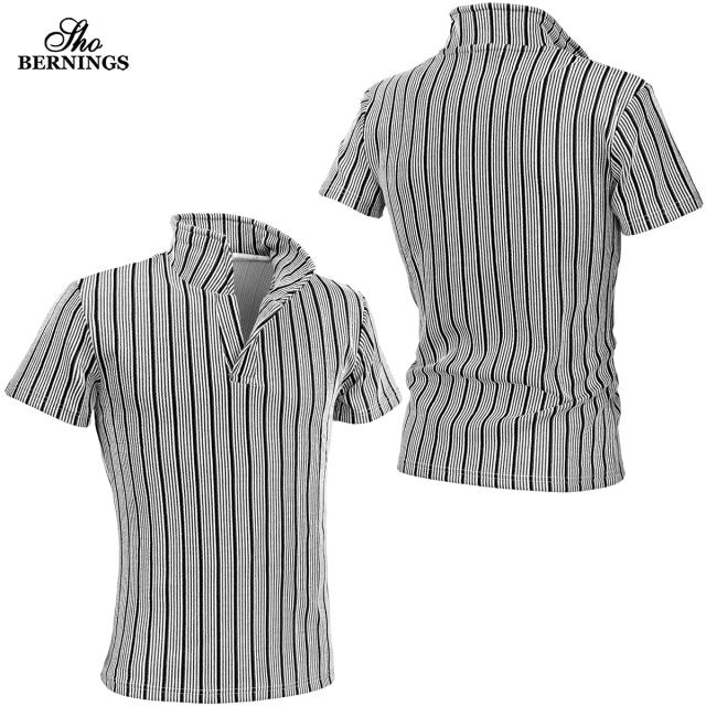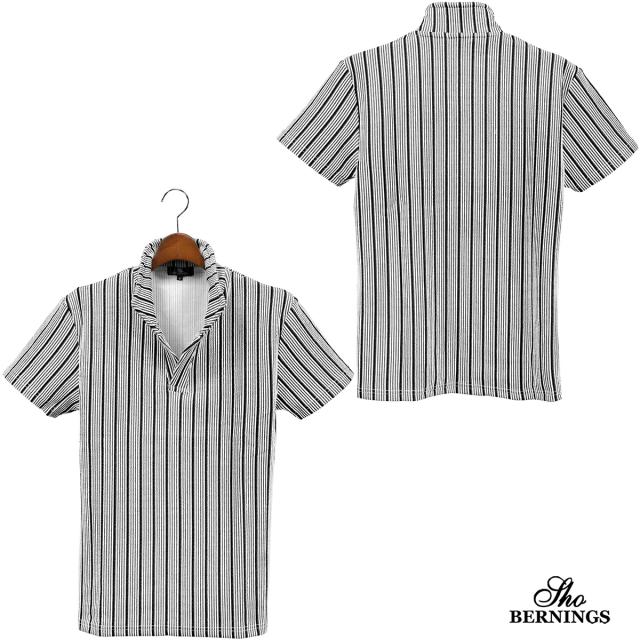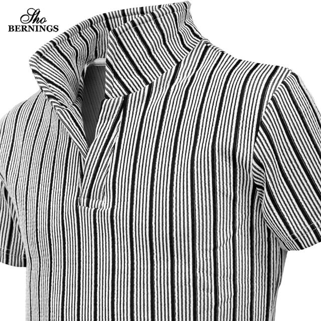 ポロシャツ 半袖 イタリアンカラー ストライプ柄 メンズ スキッパー 襟ワイヤー ストレッチ mens(ホワイト白) 304222
