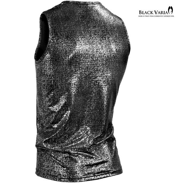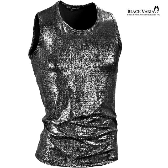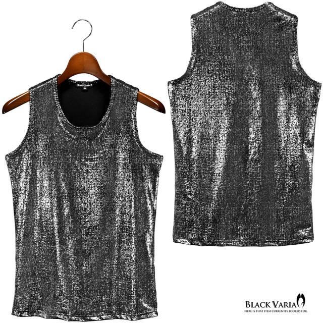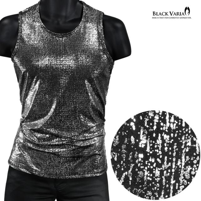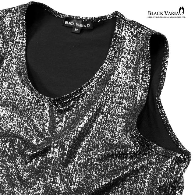 メール便可/1枚まで タンクトップ ムラ柄 箔プリント メンズ ストレッチ 光沢 細身 mens(ブラック黒×シルバー箔) 213700