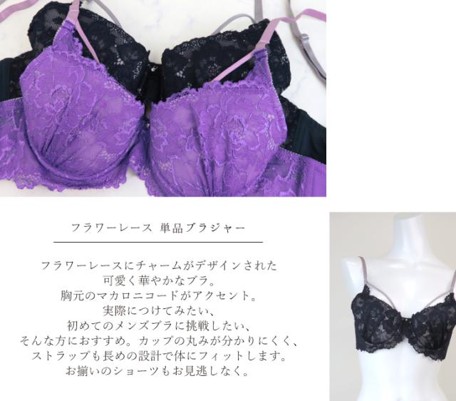 フラワーレースにチャームがデザインされた可愛く華やかなブラ。胸元のマカロニコードがアクセント。実際につけてみたい、初めてのメンズブラに挑戦したい、そんな方におすすめ。カップの丸みが分かりにくく、ストラップも長めの設計で体にフィットします。お揃いのショーツもお見逃しなく。