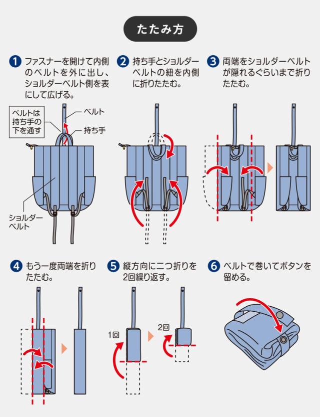 2. 持ち手とショルダーベルトの紐を内側に折りたたむ。