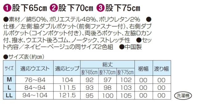 ●仕様/左側:脇ダブルポケット(前側ファスナー付)、右側ダブルポケット(コインポケット付き)、両後ろポケット、左脇Dカン付、撥水、ウエスト後ろゴム、ノータック、ストレッチ性