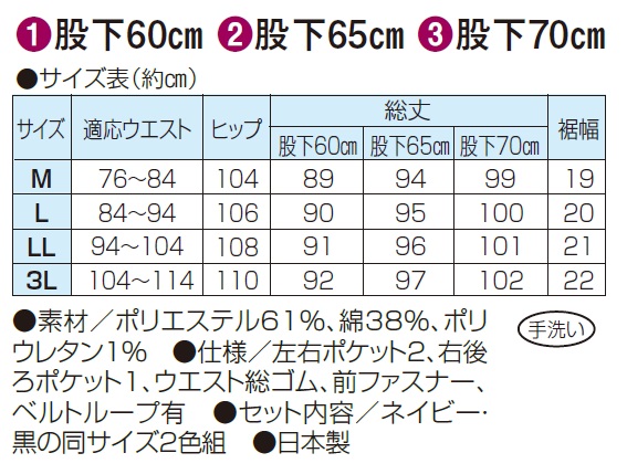 ●仕様/左右ポケット2、右後ろポケット1、ウエスト総ゴム、前ファスナー、ベルトループ有
