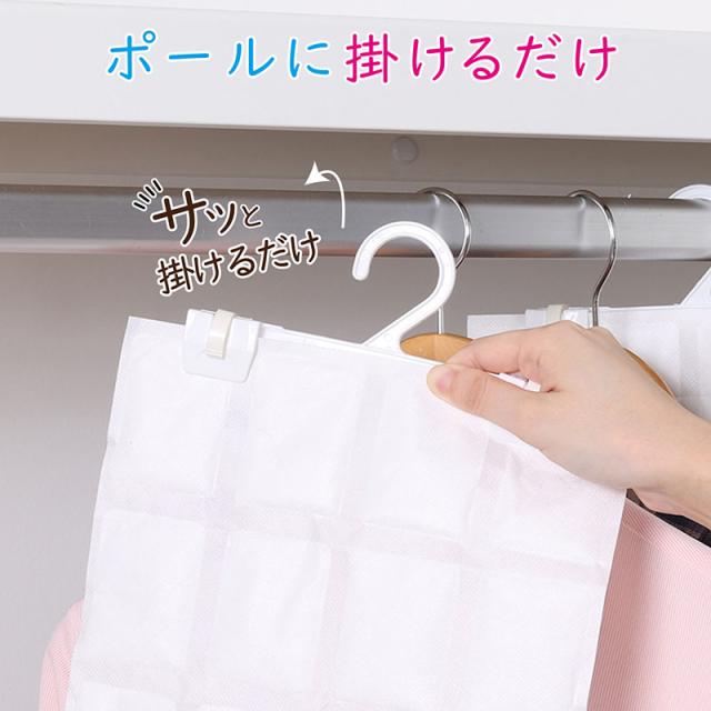 ●クローゼットなどに吊り下げて使える、取り外せるハンガー付きの除湿シート。