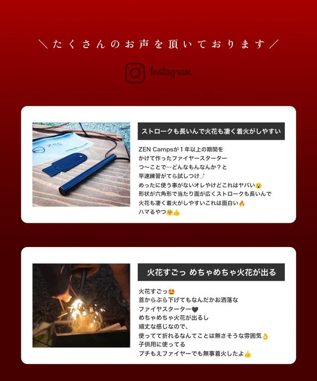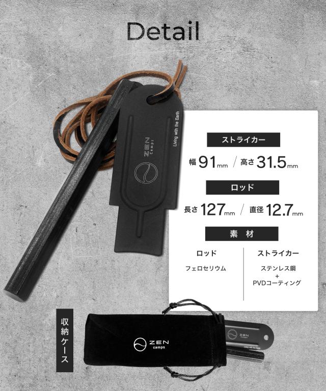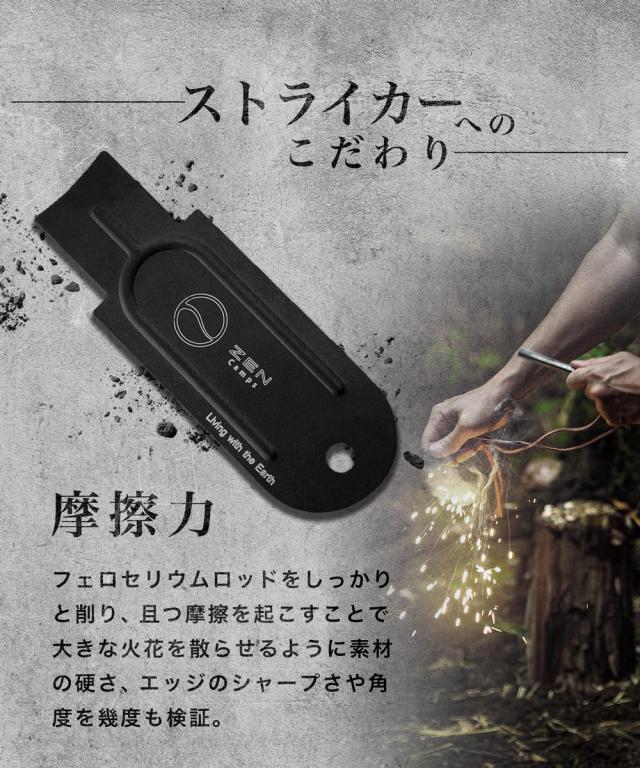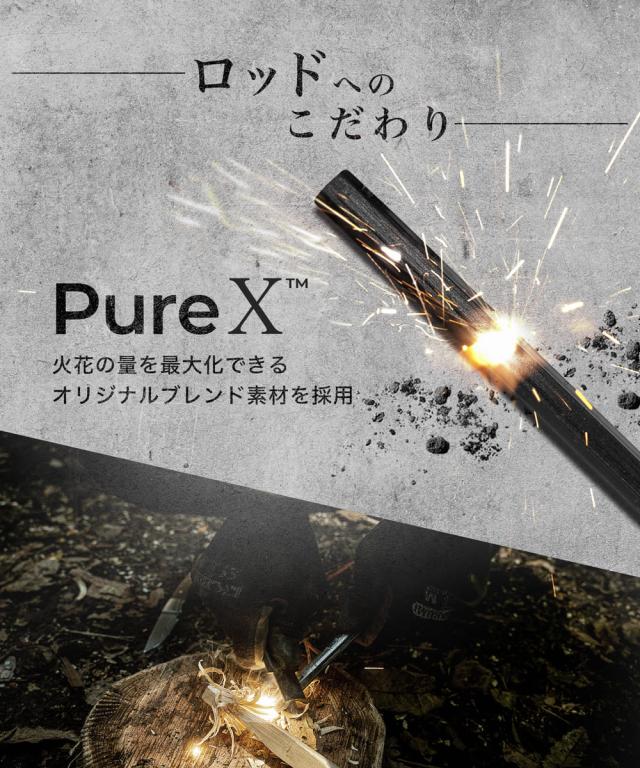 ・マグネシウムより着火に適したフェロセリウムの極太ロッドを使用。3,000℃の火花を出す事ができます。また着火に適した硬度、火花の量を追求した素材のオリジナルブレンドPure-Xを採用。