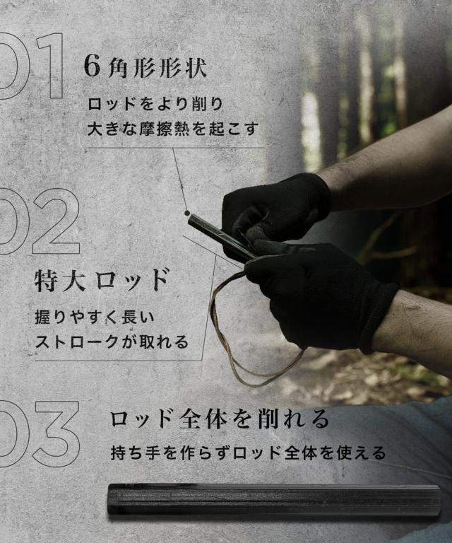 ・素材、硬度、形状に優れたロッド、火花を散らすことを徹底的に考え抜いたストライカー、これらによって異次元の着火力を実現しました。これまでファイヤースターターで火起こしがうまくできなかった方、初めて火おこしに挑戦する方にもおすすめです。ブッシュクラフトでは必須のアイテムです!