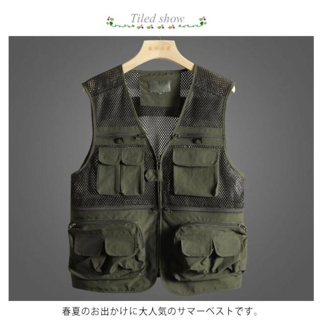 | ポケットたくさん、手ぶらでお出かけ! 春夏のお出かけに大人気のサマーベストです。 清涼感のある薄手のコットン素材、裏身頃部分は、涼しいメッシュデザイン、大きな収納ポケットにもなります。 両サイド、両胸にポケットがあり、手ぶらでお出かけ! 散歩やお出かけ、アウトドア、釣りなどアクティブなシーンで大活躍! 父の日などの贈り物にも最適です! 薄手、軽量のお洒落な、多機能カジュアルベストです。 | |