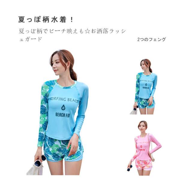 | 夏っぽ柄でビーチ映えも☆お洒落ラッシュガード 露出を抑えられる長袖で着やすく日焼け対策! お腹をしっかり隠して気になる体型をカバー◎ ショートパンツスタイル動きやすさがGOOD! | |