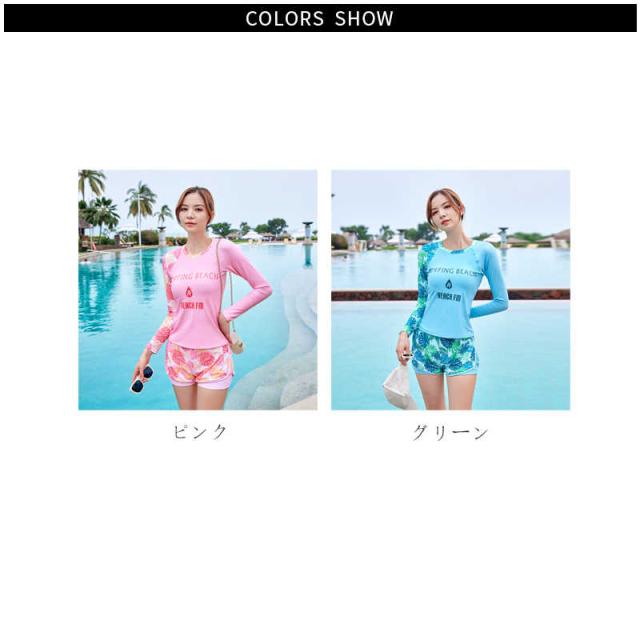 夏っぽ柄水着! レディース 体型カバー水着 30代 40代 20代 50代 60代 オトナ 女子 ママ水着 フィットネス水着 セパレート かわいい 長袖 上下セット ショートパンツ 長袖ラッシュガード スポーツウェア