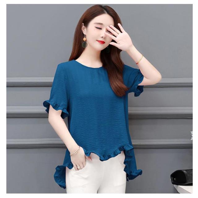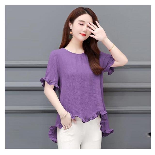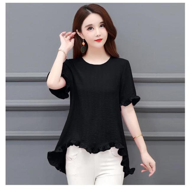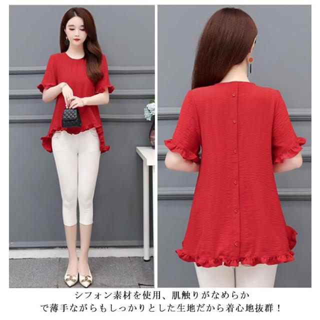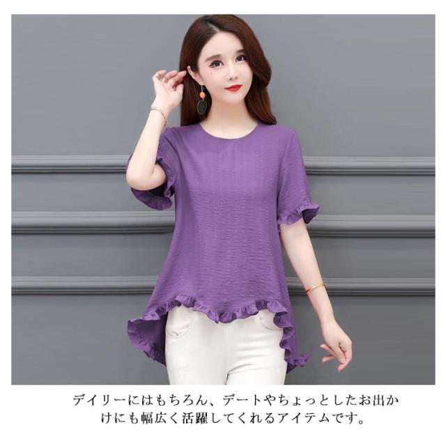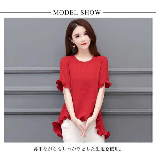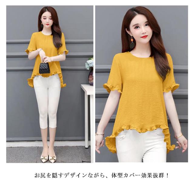テールカット ブラウス シャツ シフォントップス 半袖シャツ 春夏 おしゃれ 体型カバー ガーリー 大きいサイズ ゆったり お尻 隠し 裾フリル 上品 L-5XL 送料無料