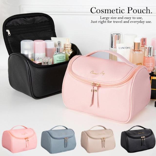 ワンポイントのロゴがシンプルでおしゃれな大容量メイクポーチです。
