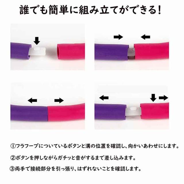 | 自宅で簡単に出来て気軽に続けられる「フラフープダイエット」 初心者でも回しやすいフィットネスフラフープ! プラスチック本体に発泡素材を巻いているので落とした時の騒音を軽減します。 柔らか素材で衝撃を軽減!身体に負担がかかりにくい。 フラフープの内側にあるなだらかな凹凸が優しくウェスト周りを刺激します。 室内でもできる有酸素運動で注目されるダイエット方法です。 誰でも簡単に組み立てができる!フラフープについているボタンと溝の位置を確認し、向かいあわせにします。ボタンを押しながらガチッと音がするまで差し込みます。両手で接続部分を引っ張り、はずれないことを確認します。 はめ込むだけのかんたん組み立て、かたづける時もワンプッシュで取り外し可能。コンパクトになるので収納に困りません。 | |