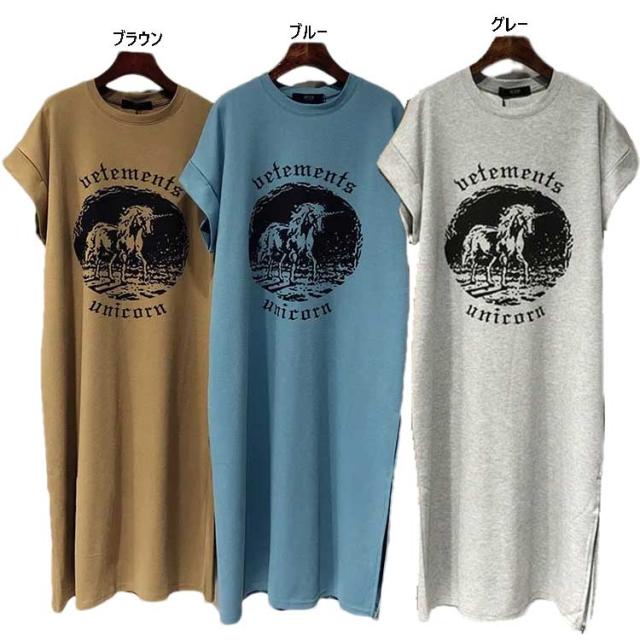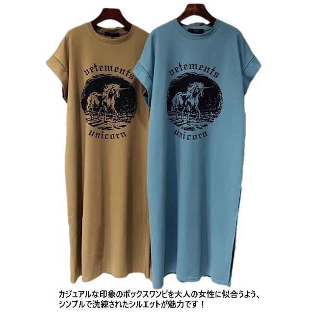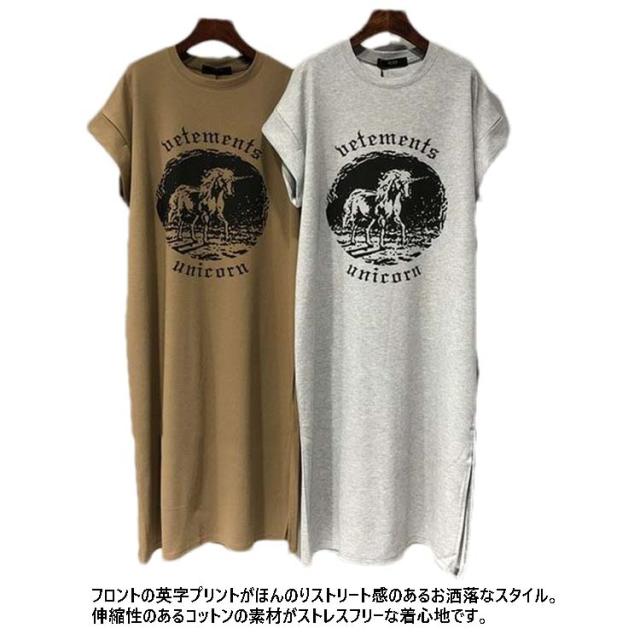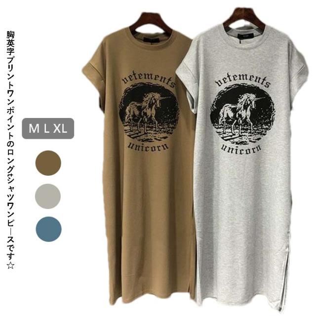 送料無料 Tシャツワンピース レディース グレー ブラウン ブルー シンプル プリント ワンピース ロング丈 チュニック レイヤード サイドスリット ドロップショルダー 送料無料 春 夏 ルームウェア