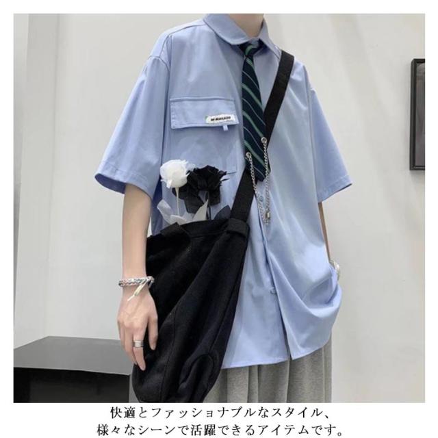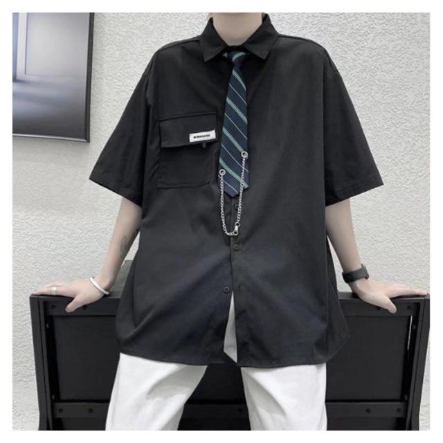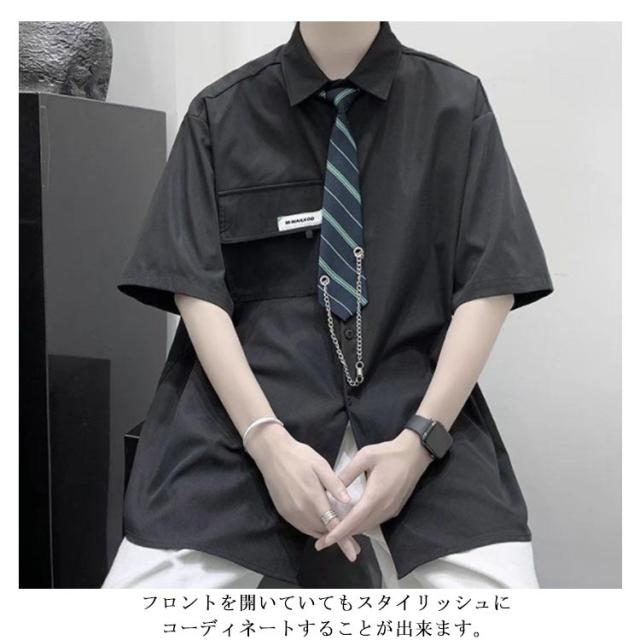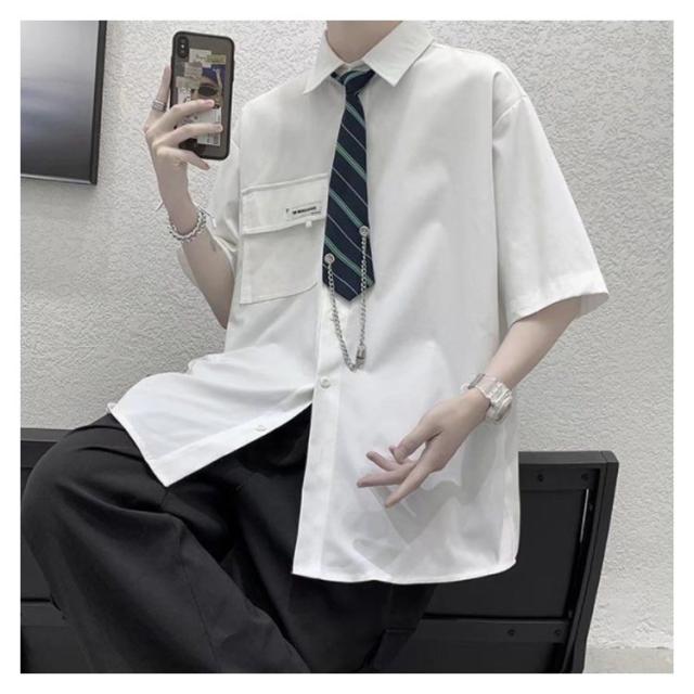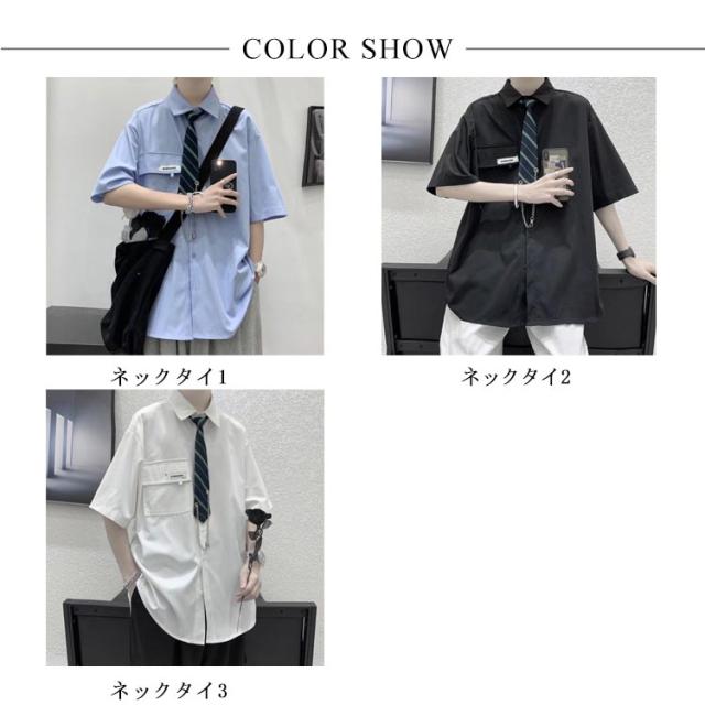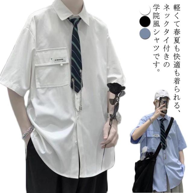 ネックタイ付き 半袖 シャツ メンズ 開襟シャツ カジュアルシャツ コットンシャツ ポケット付き 通学 コスプレ 学院風 韓国 かっこいい M L XL 2XL 3XL