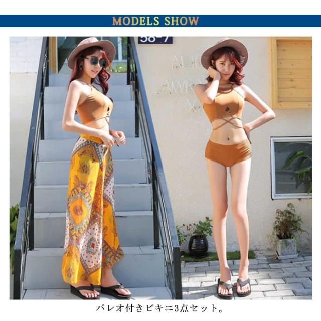 | パレオ付きビキニ3点セット。 ブラジャー+ショートパンツ+スカート。 肩ひも調節可能。 華奢魅せ&体型カバーが叶う! ショートパンツが気になるヒップ〜太ももをしっかりオシャレにカバー◎ | |
