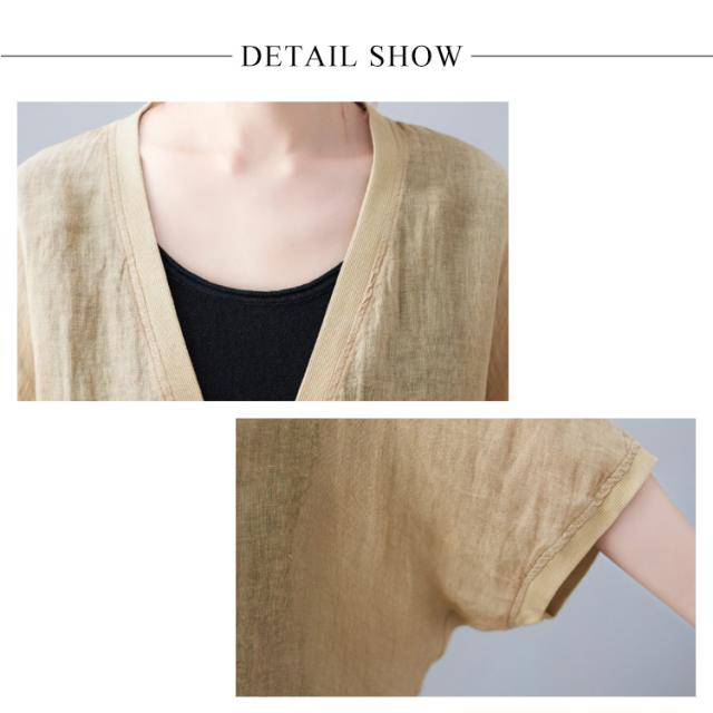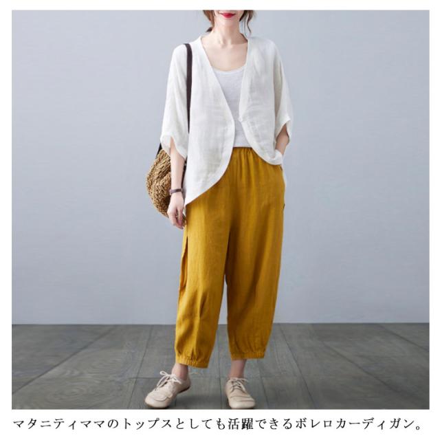 | どんなアイテムにも合わせやすいショート丈リネンカーディガン。 ナチュラルな綿麻素材が通気性が良くて、涼しい、お肌に優しい◎ 二の腕をカバーしてくれるドルマン7分袖、UV対策や冷房対策にもおススメ。 ゆったりしたリラックスなシルエット、腰周りなど気になるところをさり気なくカバーし、上下Vラインになったデザインが着痩せ効果抜群◎ 薄手の生地なので、かさばらず、バッグなどに収納しての持ち運びにも便利。 マタニティママのトップスとしても活躍できるボレロカーディガン。 | |