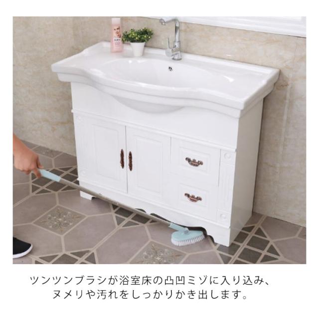 | お風呂掃除に欠かせないバスブラシ! 浴槽や床・天井・壁際などこれ一本でお掃除OK。 ツンツンブラシが浴室床の凸凹ミゾに入り込み、ヌメリや汚れをしっかりかき出します。 ブラシの先端がV字型で四隅や壁際までしっかり届き汚れをかき取ります。 180度と自由自在にヘッドが動くので狭い浴室の掃除もラクラクできます。 ヘッド部分を取り外せばハンディブラシとしても使えます。 グリップ部分にはフックに掛けられる穴が空いていてつるして収納できます。 ご高齢の方や女性でも、少ない力で使えてしっくりと手に馴染む握り心地になっています。 ブラシ部分も取り外して交換ができます。替えブラシ付属1個! | |