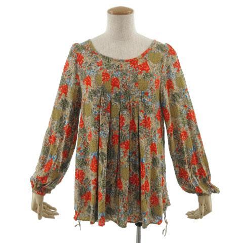 【中古】レイビームス Ray Beams カットソー 長袖 ギャザーネック 総柄 グレージュ マルチカラー レディース