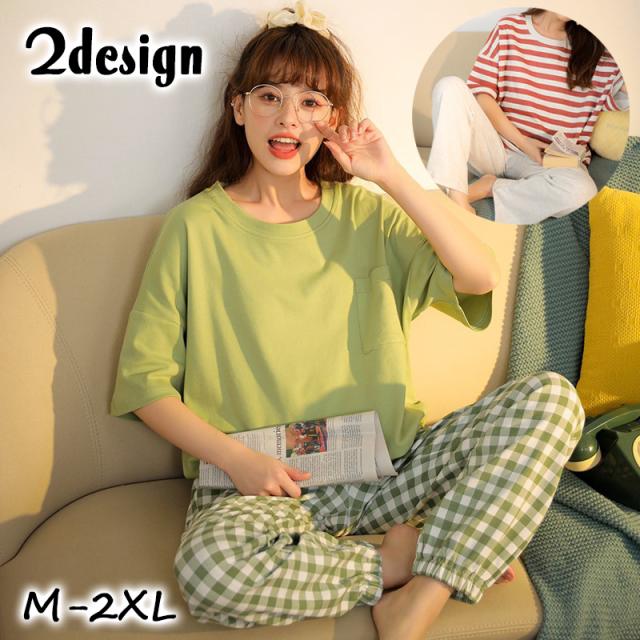 ルームウェア 上下セット 半袖 長ズボン レディース ラウンドネック Tシャツ ロングパンツ チェック ボーダー ドロップショル