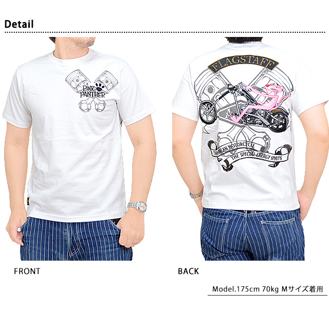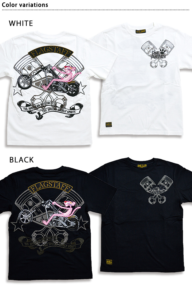 斬新なアイディアとインパクトのあるデザインが魅力的な、絡繰魂の姉妹ブランド【Flagstaff】より「ピンクパンサー×フラッグスタッフ半袖Tシャツ(422072)」のご紹介です。 アメリカの人気アニメーションのキャラクター「ピンクパンサー」とのコラボが実現しました! ピンクパンサーはその名の通り、ピンクの豹。 背中には愛車のバイクとピンクパンサーを大胆にデザイン。 | ||||||||||||||||||||||||||