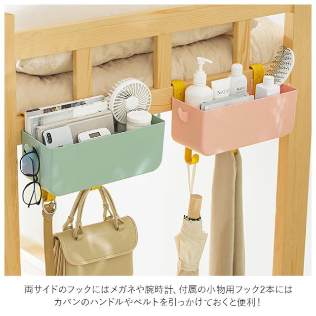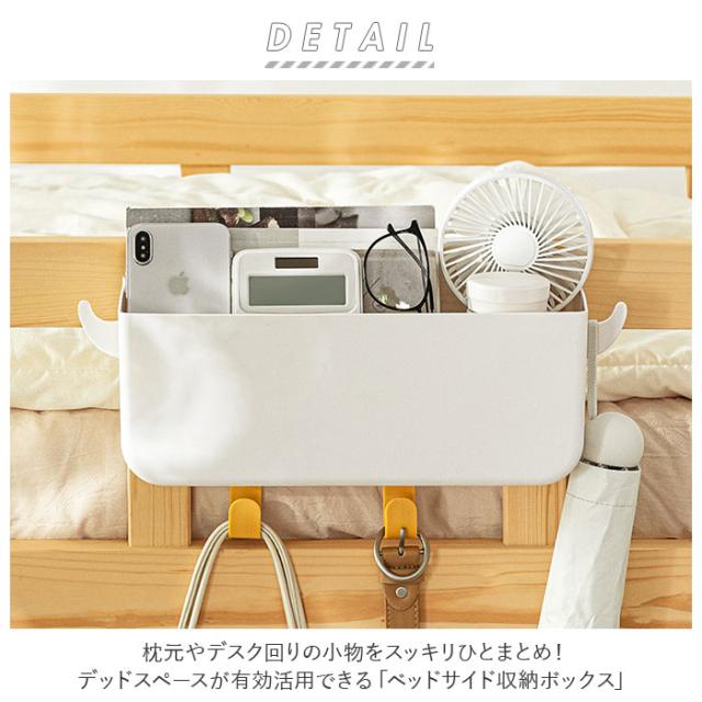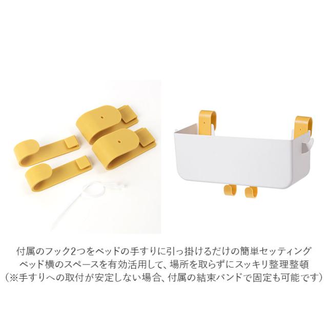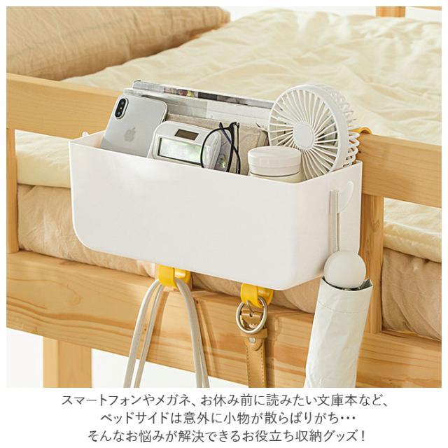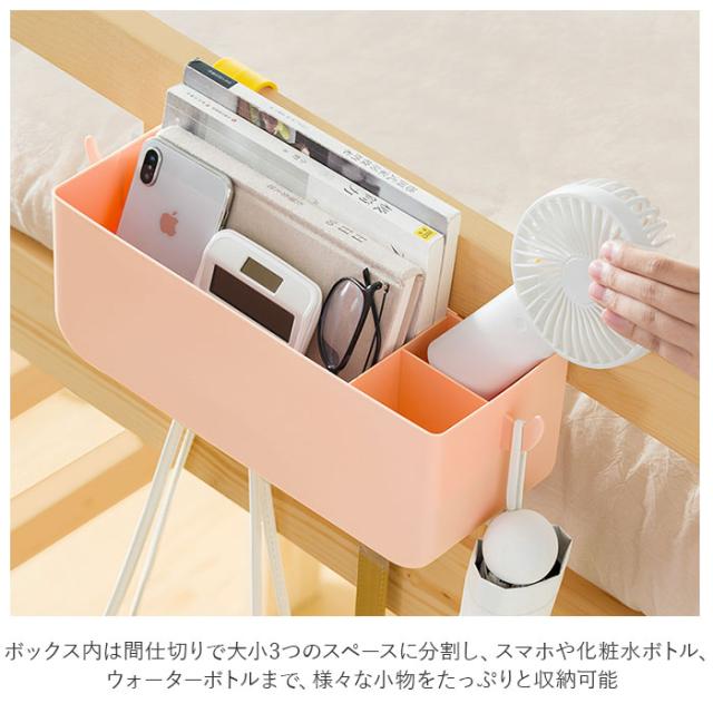 | 商品説明 | ・枕元やデスク回りの小物をスッキリひとまとめ!デッドスペースが有効活用できる「ベッドサイド収納ボックス」 ・スマートフォンやメガネ、お休み前に読みたい文庫本など、ベッドサイドは意外に小物が散らばりがち・・・。そんなお悩みが解決できるお役立ち収納グッズ! ・付属のフック2つをベッドの手すりに引っ掛けるだけの簡単セッティング。ベッド横のスペースを有効活用して、場所を取らずにスッキリ整理整頓。(※手すりへの取付が安定しない場合は、付属の結束バンドを使用し固定することもできます。) ・ボックス内側は間仕切りで大小3つのスペースに分割し、スマホや化粧水ボトル、ウォーターボトルまで、様々な小物をたっぷりと収納可能。 ・両サイドのフックにはメガネや腕時計、付属の小物用フック2本にはカバンのハンドルやベルトを引っかけておくと便利! ・ベッドサイド用ボックスとしてだけでなく、パソコンラック横での使用もオススメ。 ・フックを使用せずにドレッサーに平置きすれば、乱雑に並べてしまいがちなコスメ類も「見せる収納」に早変わり! |