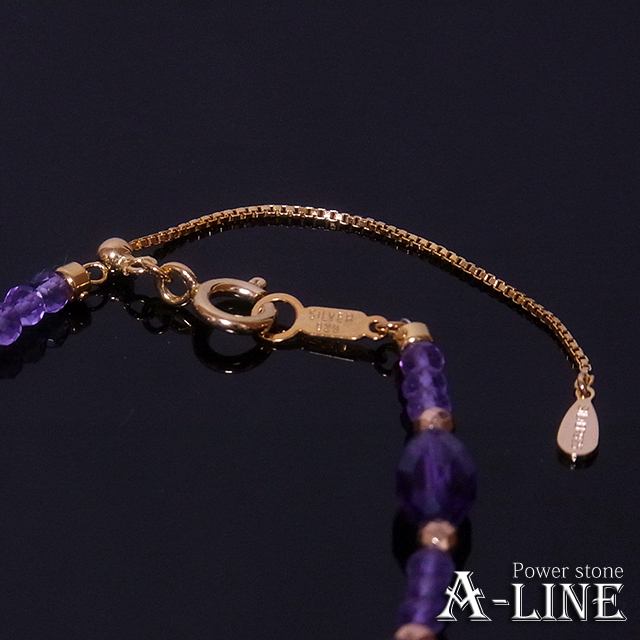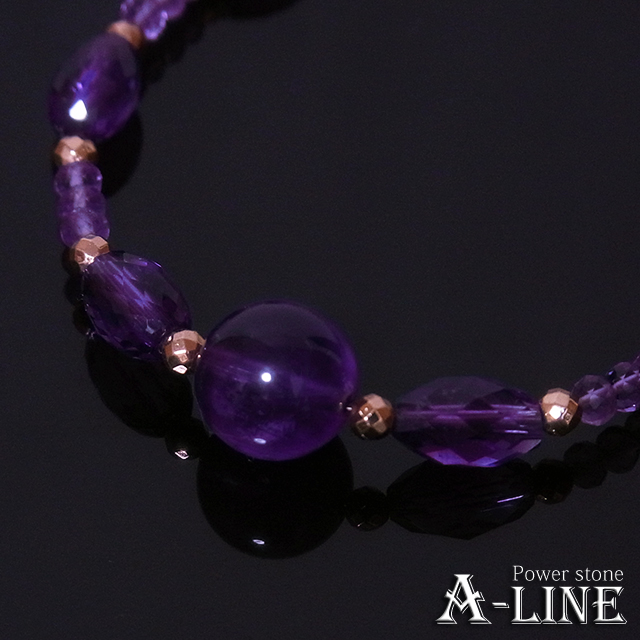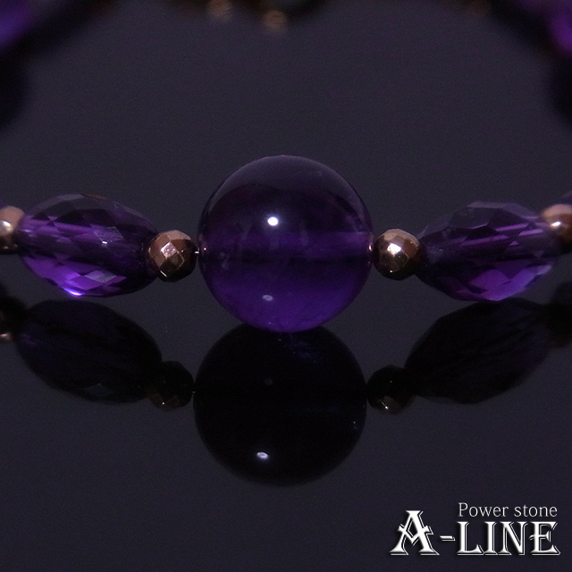 AAAアメジスト10mm、AAAアメジスト6mm×10mmライスカット、アメジストボタンカット3.5mm、ヘマタイト・ファセット(コーティング)金色、SILVER925ひき輪&スライドアジャスター金色、形状記憶超弾性ワイヤー、ワンプッシュ