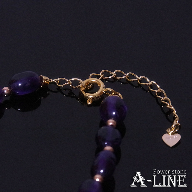 アメジスト・タンブル約6〜8mm、ヘマタイト(コーティング)2mm金色、金色SILVER925ひき輪&アジャスター、形状記憶超弾性ワイヤー、ワンプッシュ(真鍮製金メッキ処理)