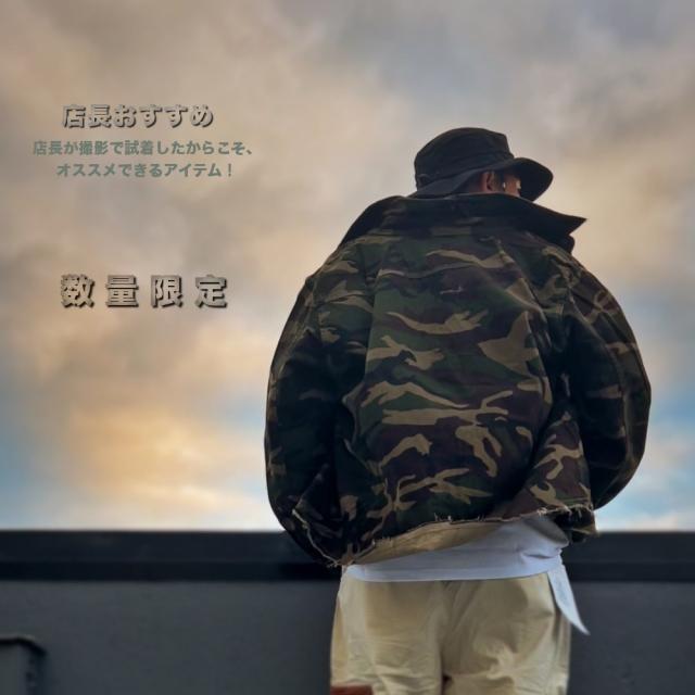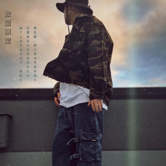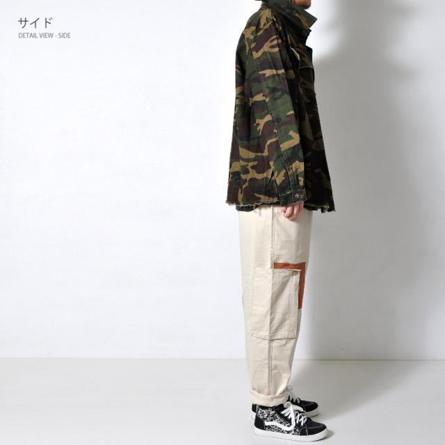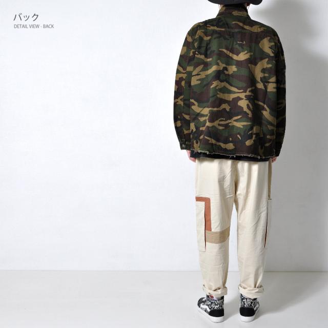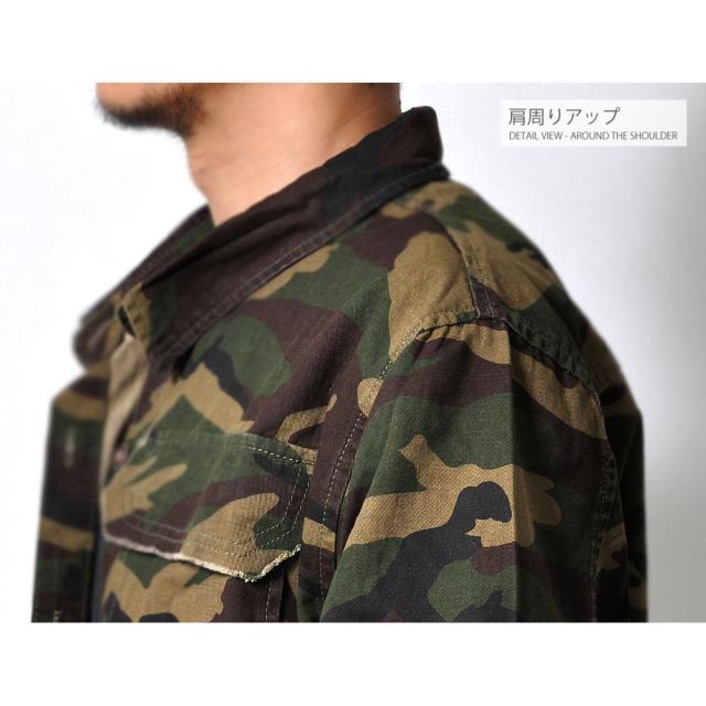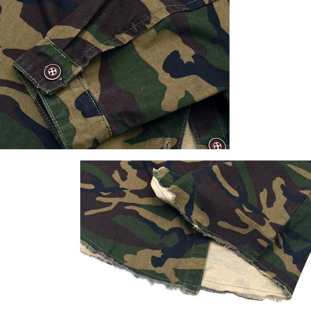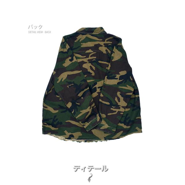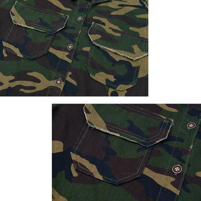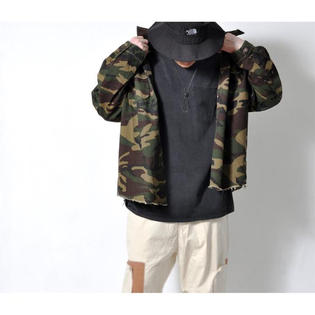 男らしさを強調した、カモフラ柄のカバーオールシャツ切りっぱなしのデザインがミリタリー感あふれる一枚