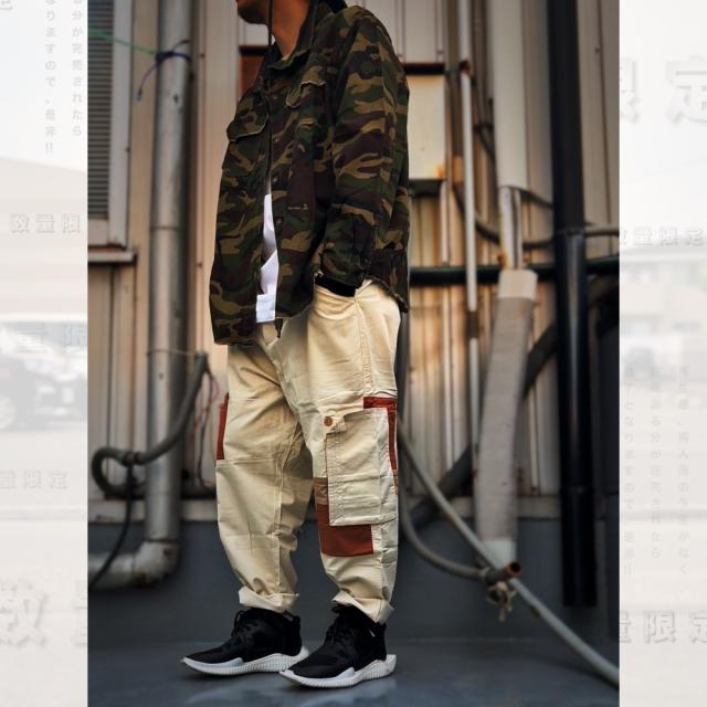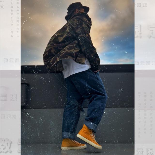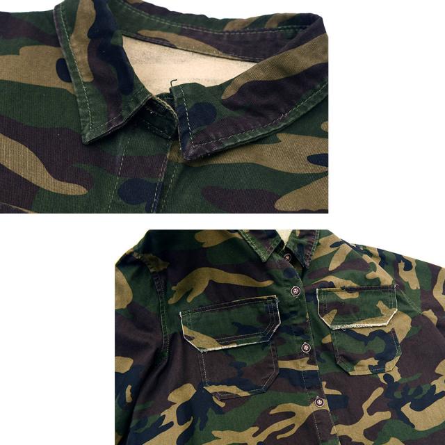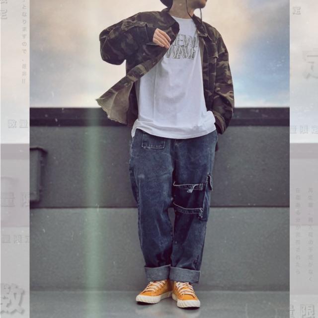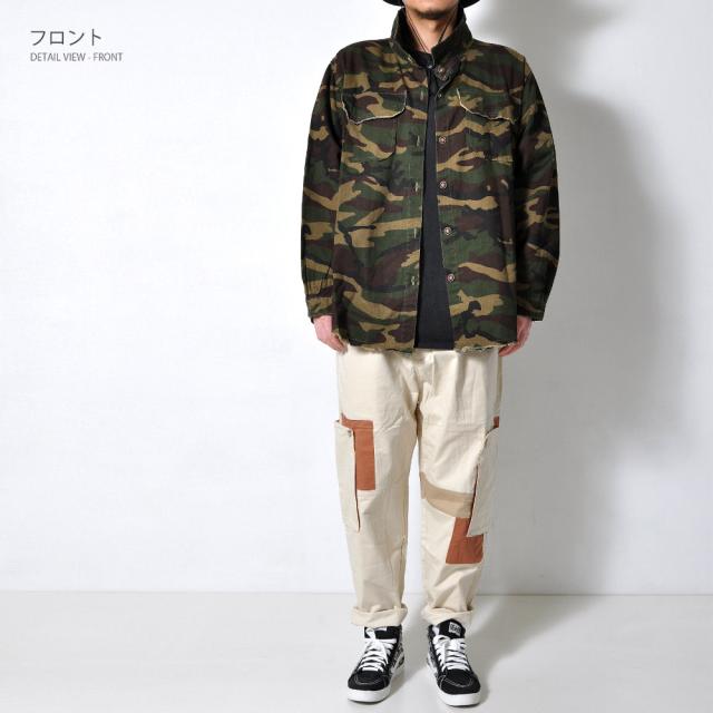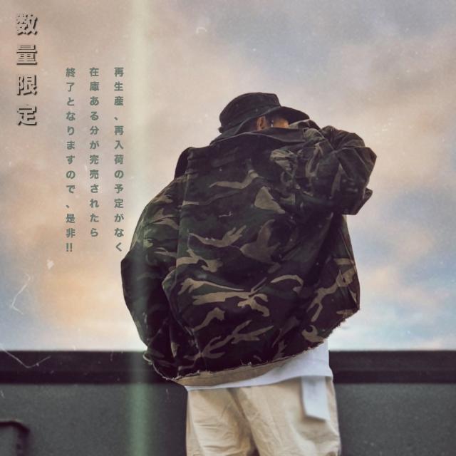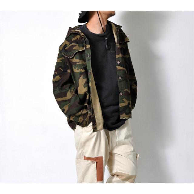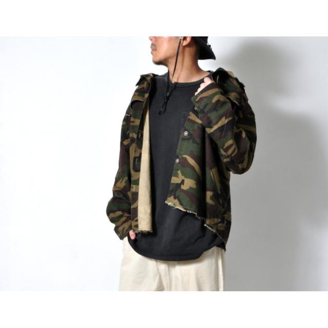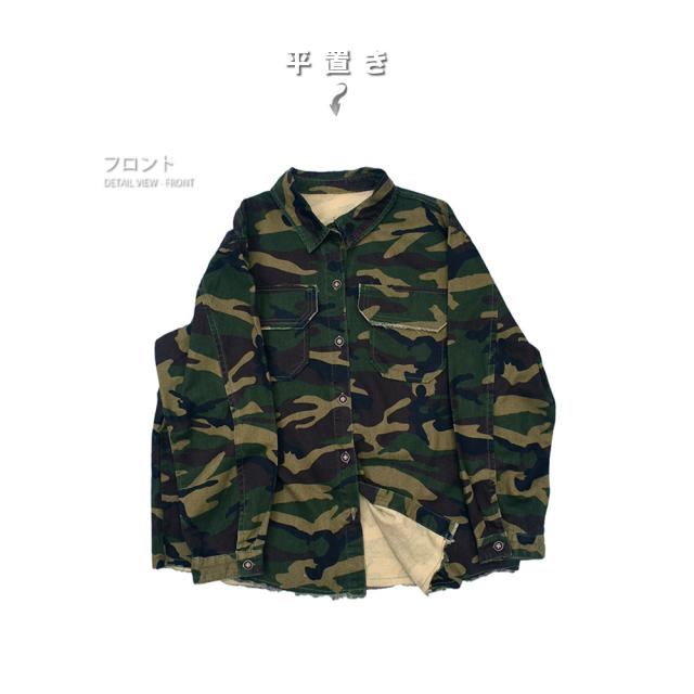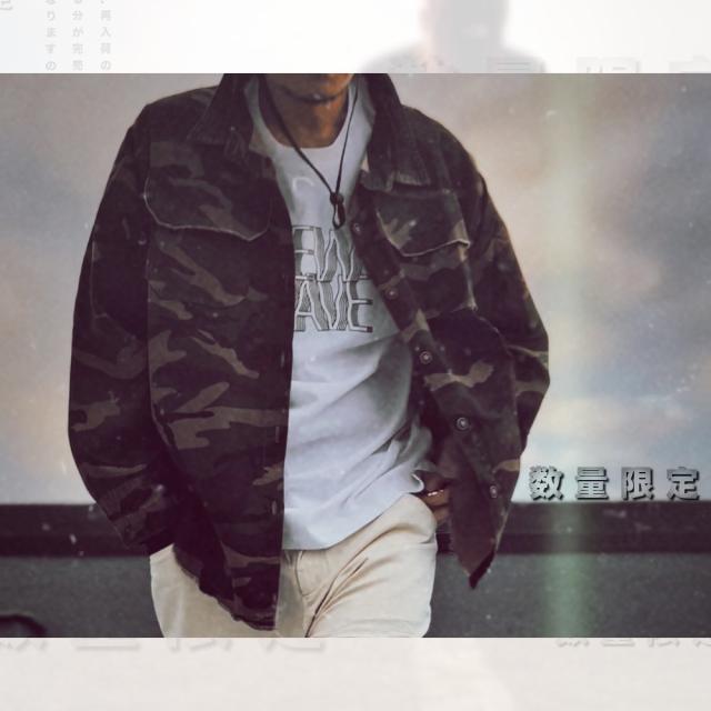 男らしさを強調した、カモフラ柄のカバーオールシャツ切りっぱなしのデザインがミリタリー感あふれる一枚