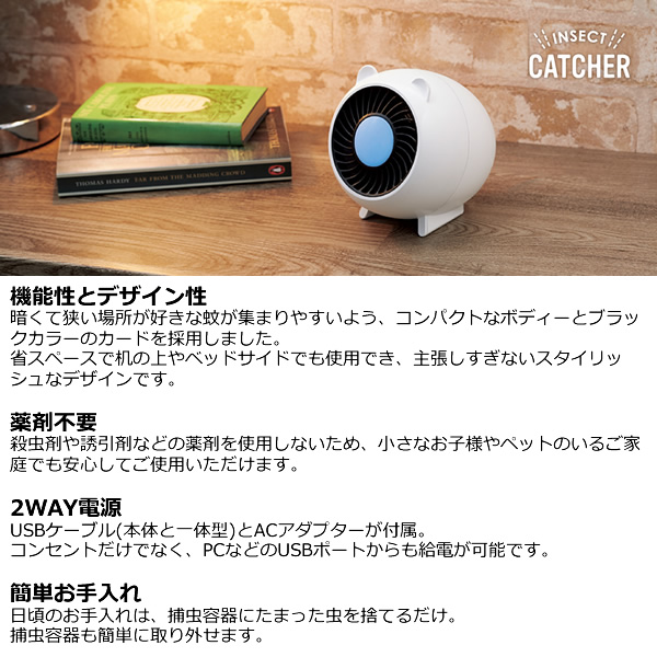 薬剤不要のLED蚊取り捕虫器。 紫外線に近い365nm波長のLEDを採用。 紫外線に集まる習性のある蚊を誘引し、ファンで吸い込みます。 弁構造のかごで、一度吸い込んだ蚊を逃がさず風化死させます。 ■サイズ 約W115×D140×H135(mm) ■重量 約0.2kg ■使用電源(専用ACアダプター) 入力:100-240V 50/60Hz 0.25A 出力:5V 1.0A ■本体消費電力 2.3W ■USBケーブル長さ 約0.9m ■材質 本体:ABS LEDカバー:AS ■付属品 ACアダプター ■仕様 UV LED 365nm・:4個 簡単お手入れ 2WAY電源(USBケーブル、ACアダプター) 騒音値:40dB(自社測定) ※記載は商品仕様の一部です。仕様説明不足等の理由での返品はできません。特に適合等は必ずご確認ください。