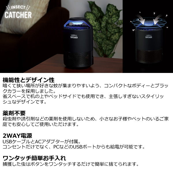 薬剤不要のLED蚊取り捕虫器。 紫外線に近い365/395nm波長のLEDを採用。 紫外線に集まる習性のある蚊を誘引し、ファンで吸い込みます。 弁構造のかごで、一度吸い込んだ蚊を逃がさず風化死させます。 ■サイズ 約W140×D130×H223(mm) ■重量 約0.4kg ■使用電源(専用ACアダプター) 入力:100-240V 50/60Hz 0.25A 出力:5V 1.0A ■本体消費電力 2.8W(静音モード)/3.2W(強モード) ■USBケーブル長さ 約1.0m ■材質 本体:ABS LEDカバー:PC 捕虫容器側面:スチール ■付属品 USBケーブル、ACアダプター ■仕様 UV LED 365nm・:4個、395nm:4個 強モード、静音モード ワンタッチ簡単お手入れ 2WAY電源(USBケーブル、ACアダプター) 騒音値:44dB(強モードのとき)(自社測定) ※記載は商品仕様の一部です。仕様説明不足等の理由での返品はできません。特に適合等は必ずご確認ください。