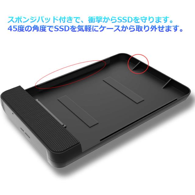 - 商品はしっかりとした造りになっており、SSDを取り付けたがケース両端にスポンジの緩衝材が付いておりデバイスがケース内でがたつくことはない。HDDを取り付けてもガタつくことはないだろう。 添付のUSBケ...