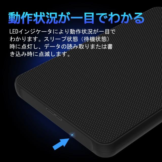 このHDD/SSDケースは厚さ9.5mm以下の2.5インチSATAI/II/III HDDとSSDをモバイルハードディスクに変身でき、PCなどと簡単に接続できます。大切なHDDとSSDを外部の傷から保護し、使用を思う存分に最大化します。 1GBのファイルを5秒で転送できます。USB3.2 Gen1接続時は転送速度が5Gbps(理論値)まで達することができ、UASP高速転送モードによりさらにスピードアップが期待できます。USB 2.0とも下位互換性があります。最大6TBのハードディスクをサポートし、ハイビジョンの動画や、大量の写真などの大容量データもストレスを感じることなく読み書きできます。ネジや工具不要で3秒でHDD/SSDの着脱が可能です。Windows 10/8/7、Linux、Mac OSに対応、挿すだけで認識可能です。データ転送停止状態で3分経過すると自動的に電源が切れます。HDDの使用寿命を伸ばす上に省エネを実現できます。ケースの内側に柔らかいクッションで強い揺れや振動でも、ハードディスクを保護できます。LEDインジケータにより動作状況が一目で分かります。接続済み時はLEDランプが青く光り、データ転送の時は青いライトが点滅します。シンプルながら、スタイリッシュなデザイン、よい手触りを持ちます。軽量で丈夫なので、HDDをしっかり守り、摩耗にも耐えます。放熱性もあり、とっても安心です!取り外し可能な50cmケーブルが付属しています。