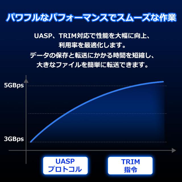 UASP、TRIM対応で性能を大幅に向上、利用率を最適化します。データの保存と転送にかかる時間を短縮し、大きなファイルを簡単に転送できます!
