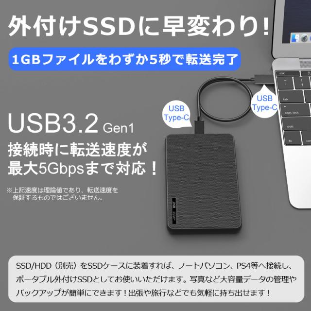 このHDD/SSDケースは厚さ9.5mm以下の2.5インチSATAI/II/III HDDとSSDをモバイルハードディスクに変身でき、PCなどと簡単に接続できます。大切なHDDとSSDを外部の傷から保護し、使用を思う存分に最大化します。 1GBのファイルを5秒で転送できます。USB3.2 Gen1接続時は転送速度が5Gbps(理論値)まで達することができ、UASP高速転送モードによりさらにスピードアップが期待できます。USB 2.0とも下位互換性があります。最大6TBのハードディスクをサポートし、ハイビジョンの動画や、大量の写真などの大容量データもストレスを感じることなく読み書きできます。ネジや工具不要で3秒でHDD/SSDの着脱が可能です。Windows 10/8/7、Linux、Mac OSに対応、挿すだけで認識可能です。データ転送停止状態で3分経過すると自動的に電源が切れます。HDDの使用寿命を伸ばす上に省エネを実現できます。ケースの内側に柔らかいクッションで強い揺れや振動でも、ハードディスクを保護できます。LEDインジケータにより動作状況が一目で分かります。接続済み時はLEDランプが青く光り、データ転送の時は青いライトが点滅します。シンプルながら、スタイリッシュなデザイン、よい手触りを持ちます。軽量で丈夫なので、HDDをしっかり守り、摩耗にも耐えます。放熱性もあり、とっても安心です!取り外し可能な50cmケーブルが付属しています。