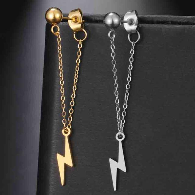 ボールとキャッチをチェーンでつなげチェーンに稲妻(いなずま/いかづち)のチャームを通したステンレス製のジャケットピアス。