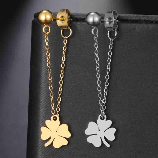 ボールとキャッチをチェーンでつなげチェーンに幸せのラッキーリーフ四葉のクローバーのチャームを通したステンレス製のジャケットピアス。