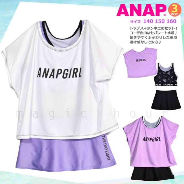 水着 子供 女の子 タンキニ ガールズ スイムウェア ANAP アナップ T付き 3点 セット ジュニア ブランド お洒落 かわいい 140cm 150cm 160cm パープル 白 黒