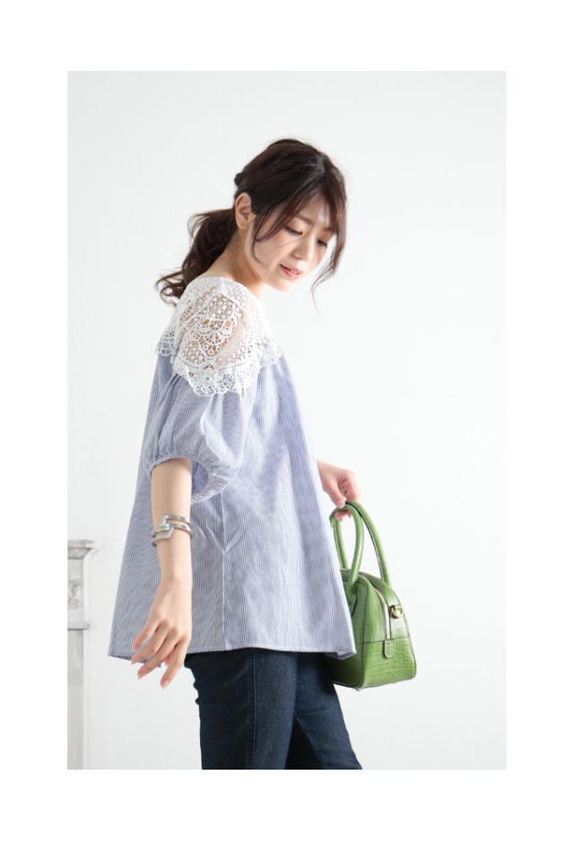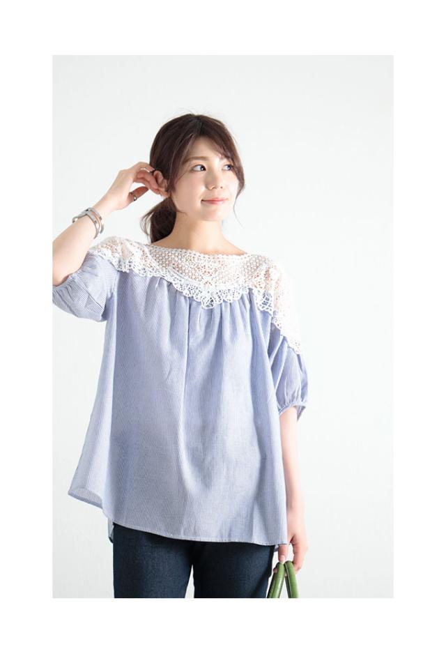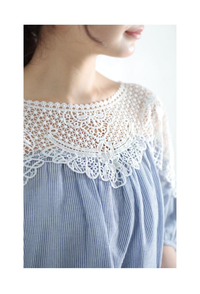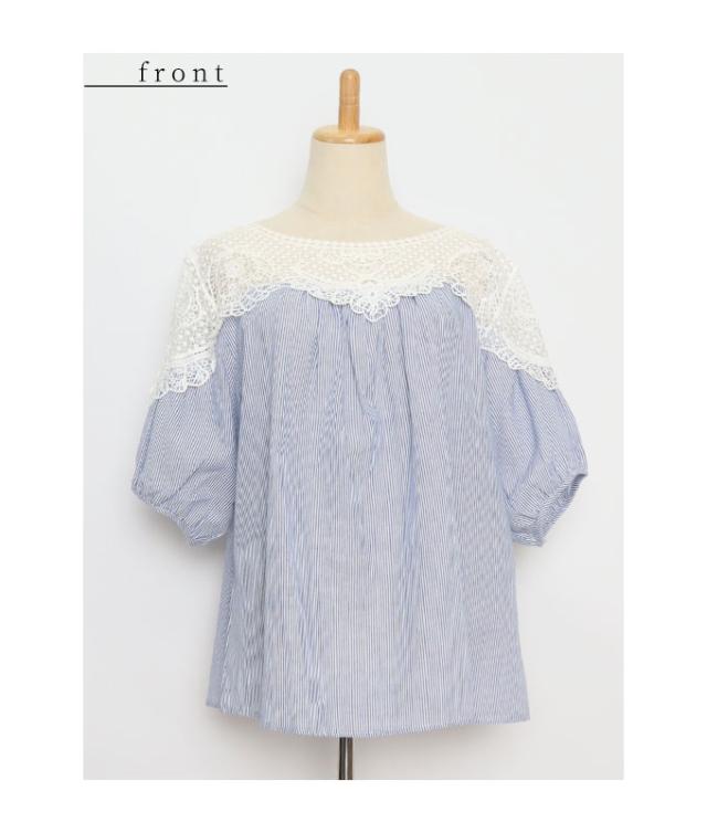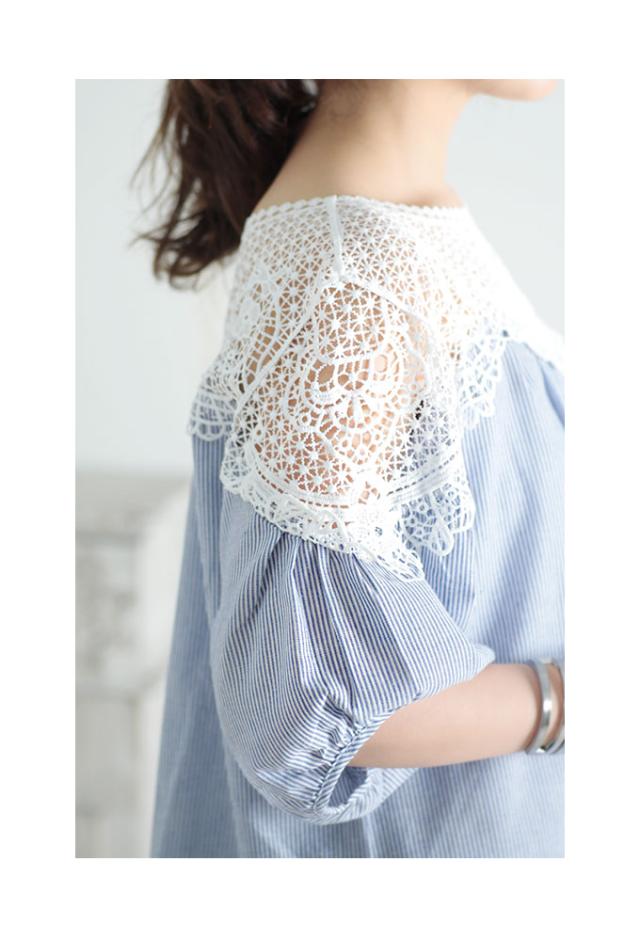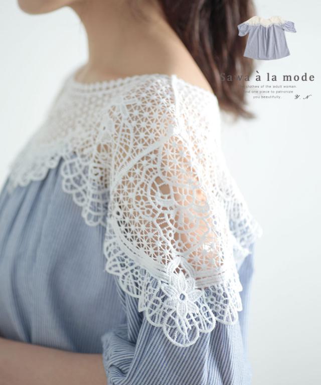 春新作 美しい花レースで華やぐストライプ柄シャツブラウス レディース ファッション トップス ブラウス シャツ 青 ブルー 春 大人可愛い 40代 レディースファッション 50代女性 ファッション 60代 ミセスファッション サワアラモード sawa a la mode otona mode-7791