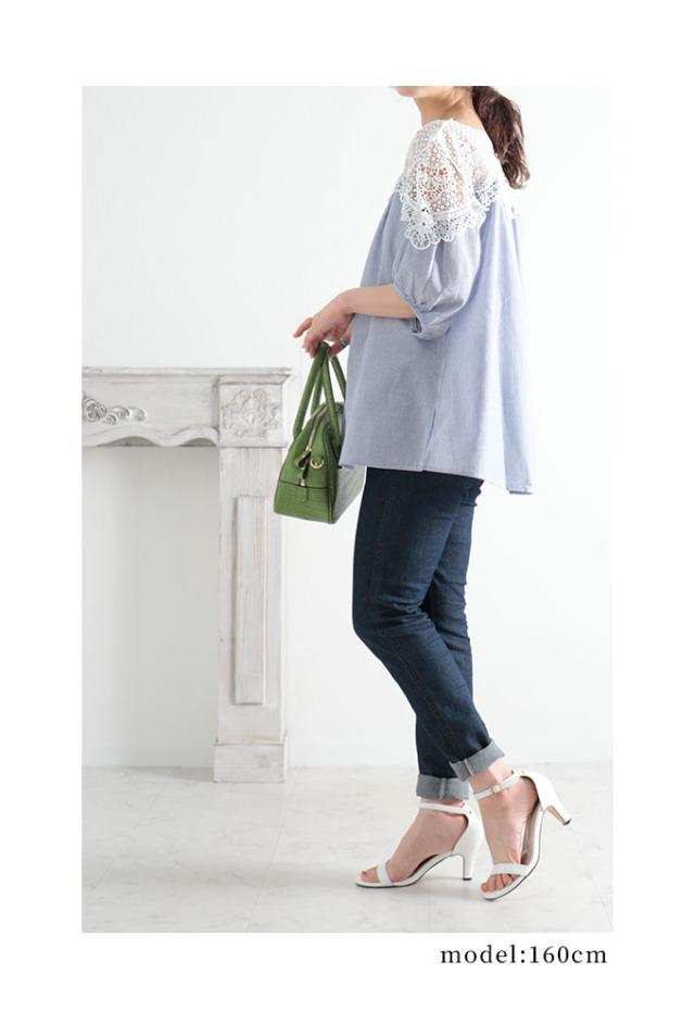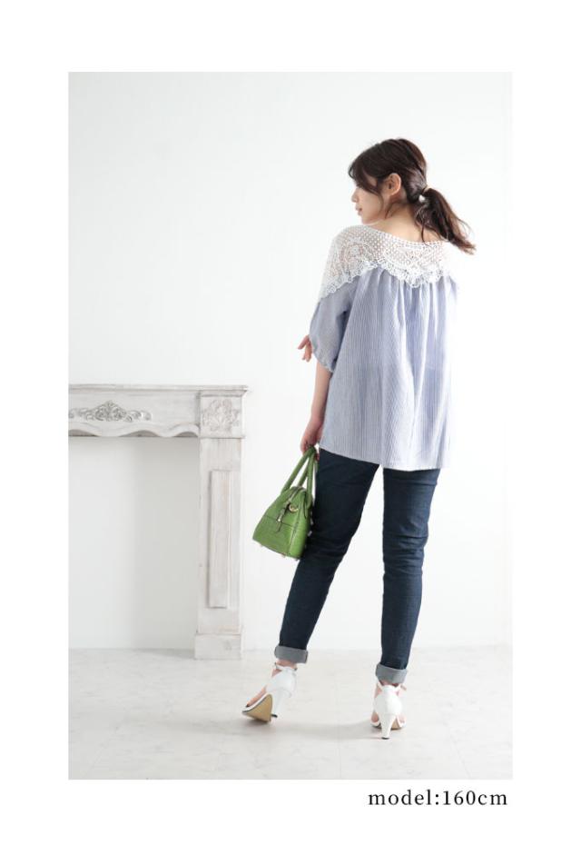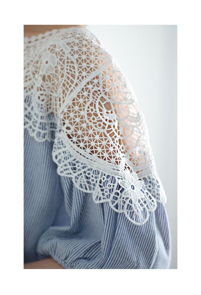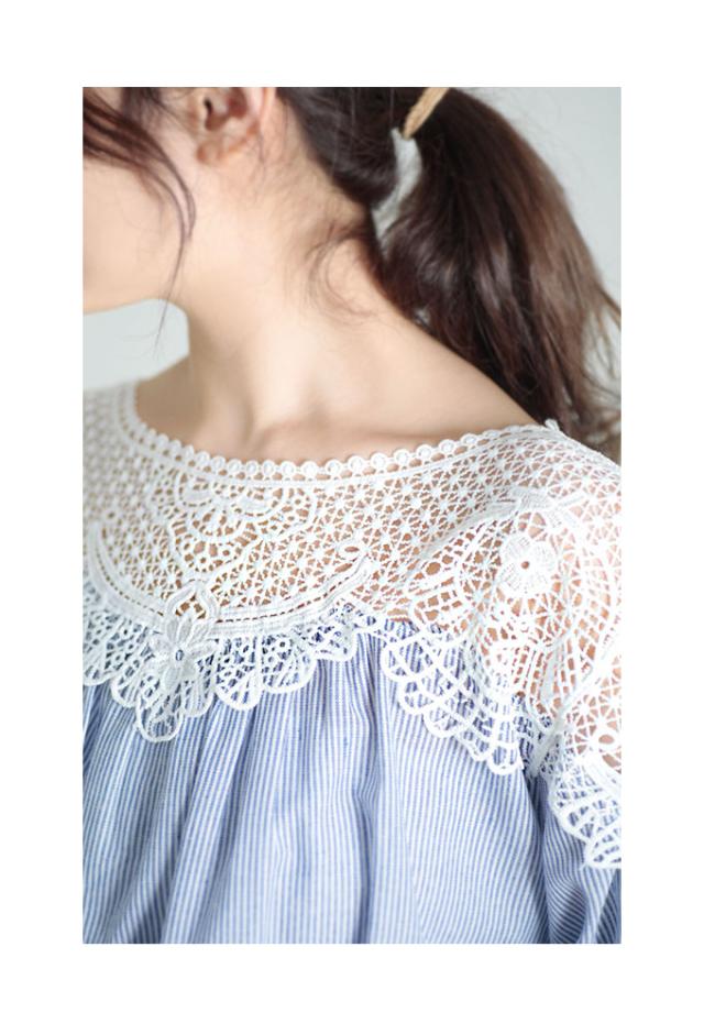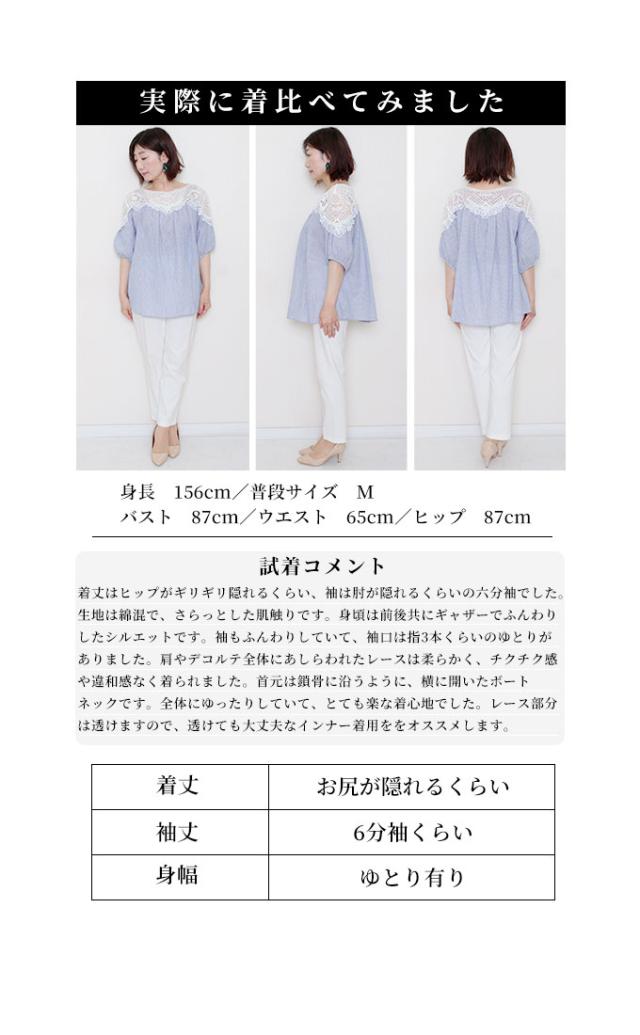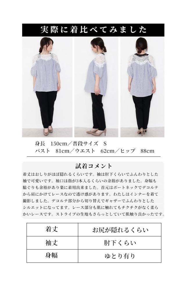 着丈はおしりがほぼ隠れるくらいです。袖は肘下くらいでふんわりとした袖で可愛いです。袖口は指が3本入るくらいの余裕がありました。身幅も脇ぐりも余裕があり楽に着用出来ました。首元はボートネックでデコルテから肩にかけてレースなので透け感があります。わたしはインナーを着て撮影しました。デコルテ部分から切り替えでギャザーでふんわりとしたシルエットになってます。レース部分も肌に触れてもチクチクがなく柔らかいレースです。ストライプの生地もさらっとしていて肌触り良かったです。