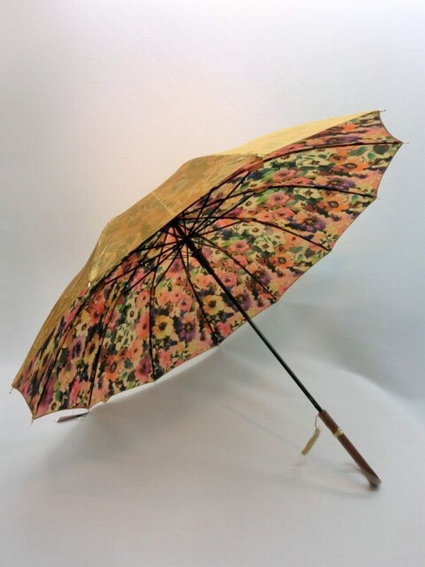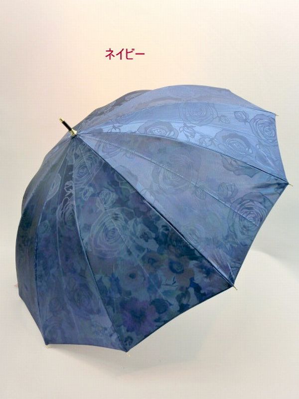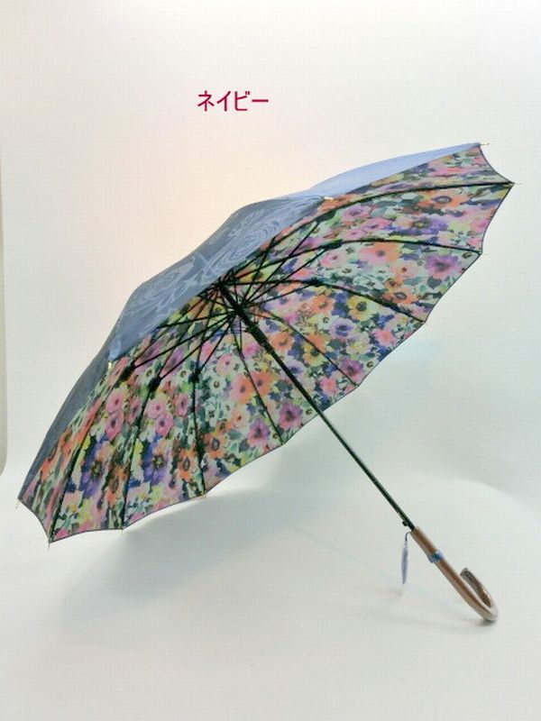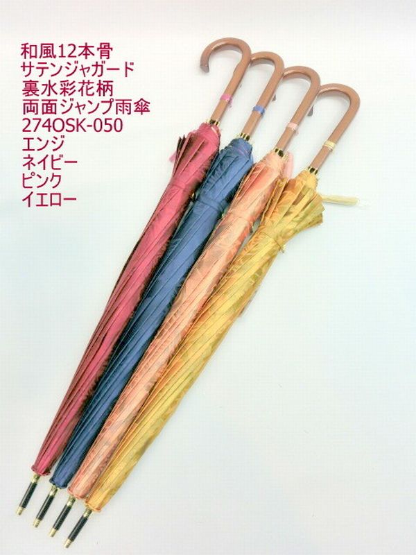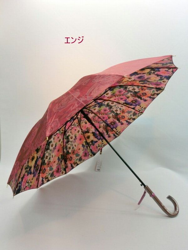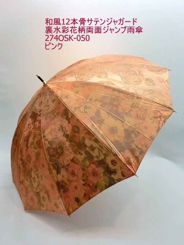| ツヤ感のある表サテンジャガード無地生地に裏面水彩花柄を転写プリントした12本骨ジャンプ雨傘です。外側は豪華な花柄ジャガード、内側に綺麗な水彩花柄が広がるのが特徴です。 和風感覚でオシャレで高級感のある長雨傘をお試し下さい。 |