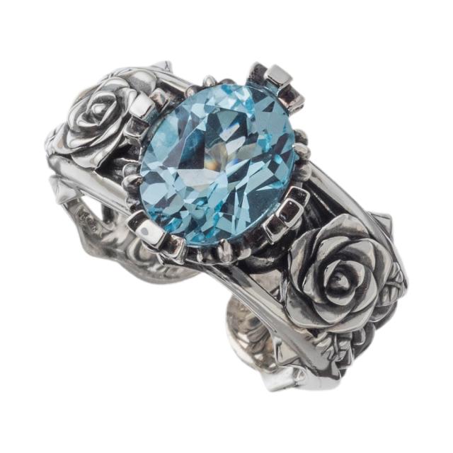 透きとおる蒼を湛えた天然ブルートパーズを、王冠の石座に気高く掲げたローズリング。サイドには薔薇のレリーフと唐草を重ね、透かしが光を通して陰影を深めます。鏡面と燻しのコントラストが細部の起伏を際立て、手元に“身に着ける彫刻”の気配を纏わせる一本。カフ式のフリーサイズは指にやわらかく沿い、微調整がしやすく快適。デザイン発案から仕立てまで統率のとれたクリエイティブ管理下で、信頼するアトリエが熟練の手仕事で一点ずつ丁寧に仕上げました。程よいボリュームは単品で主役に、重ねても美しく調和。清澄なブルートパーズが薔薇モチーフと響き合い、日常には洗練を、特別な瞬間には存在感を授けます。内側に〈925〉刻印。ホワイトトパーズ版とのペアリングもおすすめです。