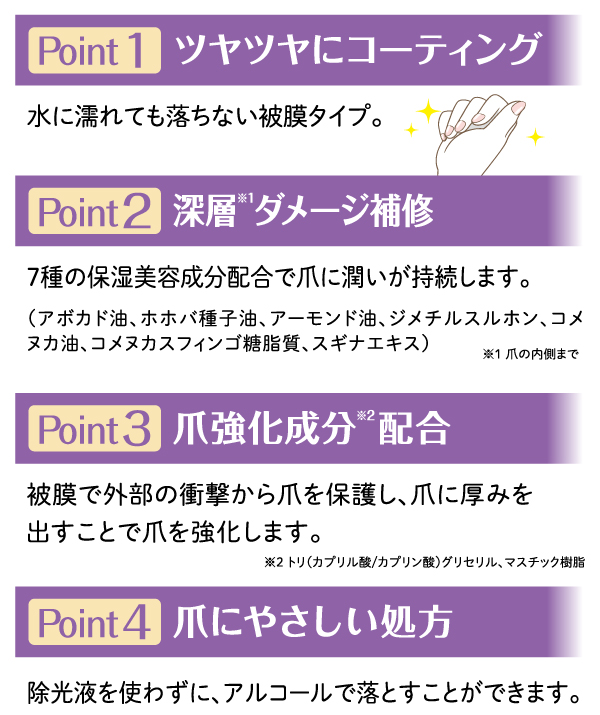 ●7種の天然・植物由来 美容成分配合で爪に浸透補修。潤いが持続。