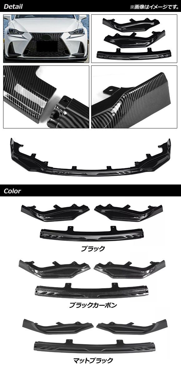 フロントリップスポイラー レクサス IS200t/IS300h/IS350 30系 Fスポーツ 中期 2016年〜2020年 マットブラック プラスチック製 入数:1セット(3個) AP-XT1522-MBK