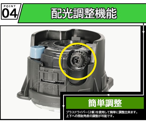 プラスドライバー(2番)を使用して簡単に調整出来ます。上下への照射角度の調整が可能です。
