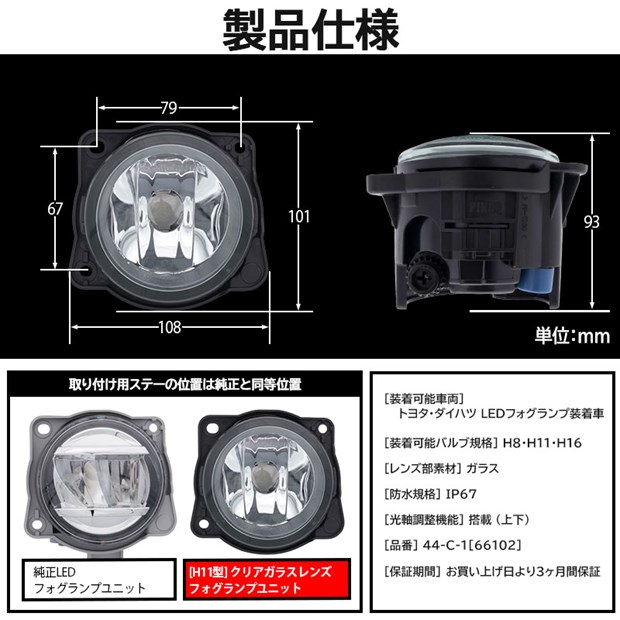 単 H11 LED トヨタ・ダイハツ 純正 対応 クリアガラスレンズフォグランプユニット LEDフォグランプと交換可能 防水 バルブ別売 44-C-1