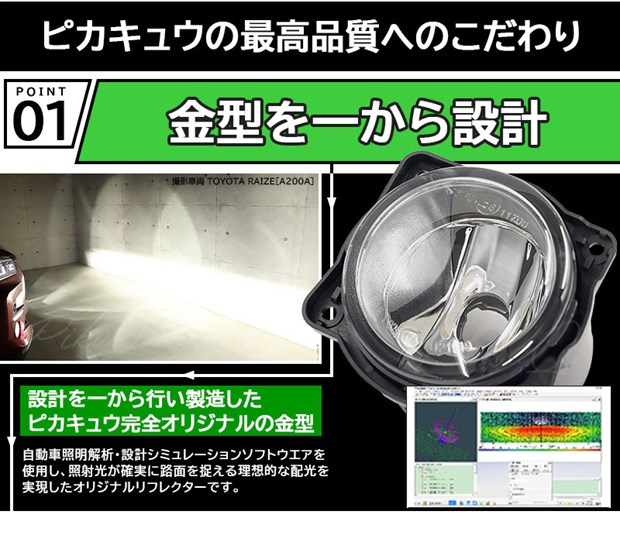 自動車照明解析・設計シミュレーションソフトウエアを使用し、照射光が確実に路面を捉える理想的な配光を実現したオリジナルリフレクター。設計を一から行い製造したピカキュウ完全オリジナルです。